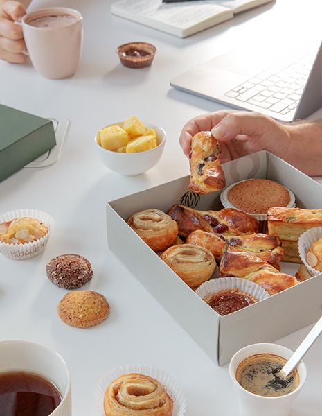 Tante proposte sfiziose e raffinate per una pausa di gusto tra dolce e salato, accompagnata da bevande calde e fredde. Viennoiserie, piccola pasticceria, biscotteria da tè, torte da forno, mini muffin si sommano ad altrettante preparazioni salate e salutari: mini croissant e tramezzini, yogurt, finger fruit e granola.