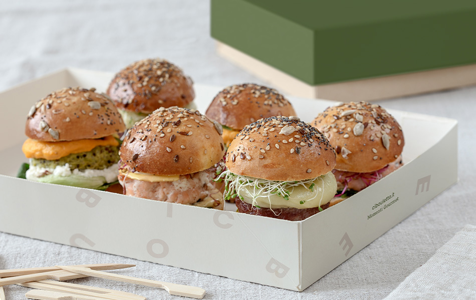 Ogni ordinazione verrà servita in pratici contenitori da utilizzare come vassoi per un servizio comodo ma raffinato.